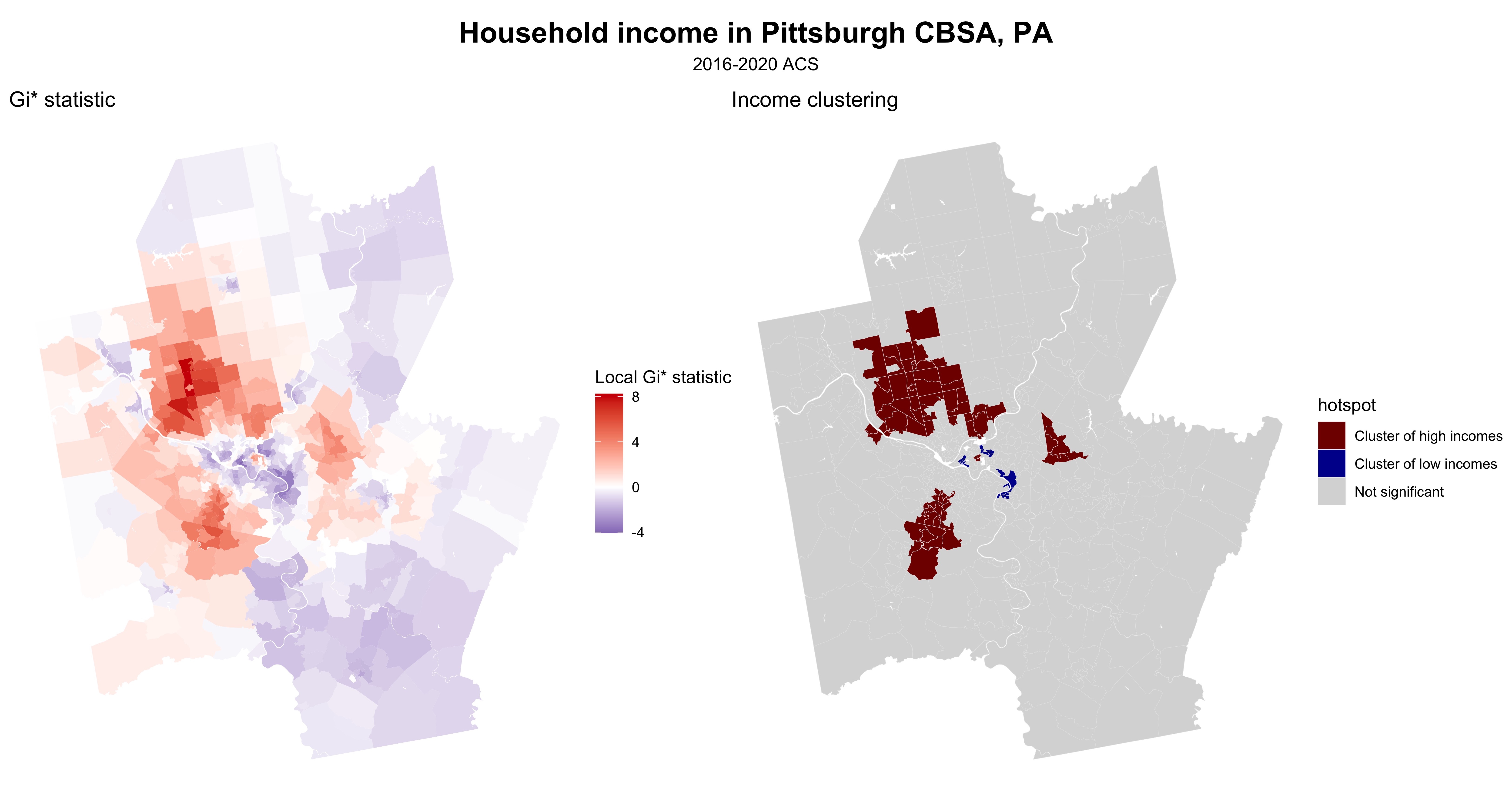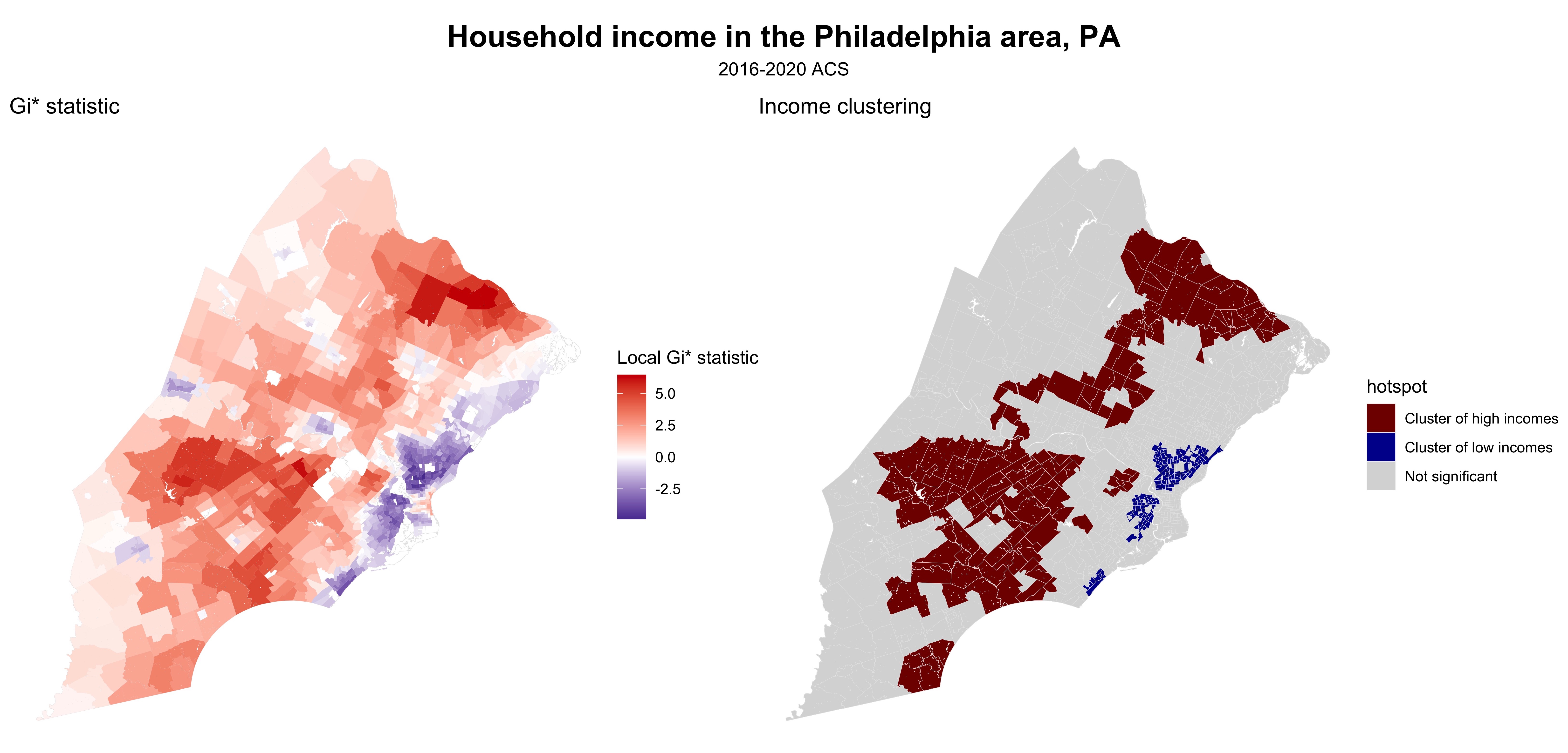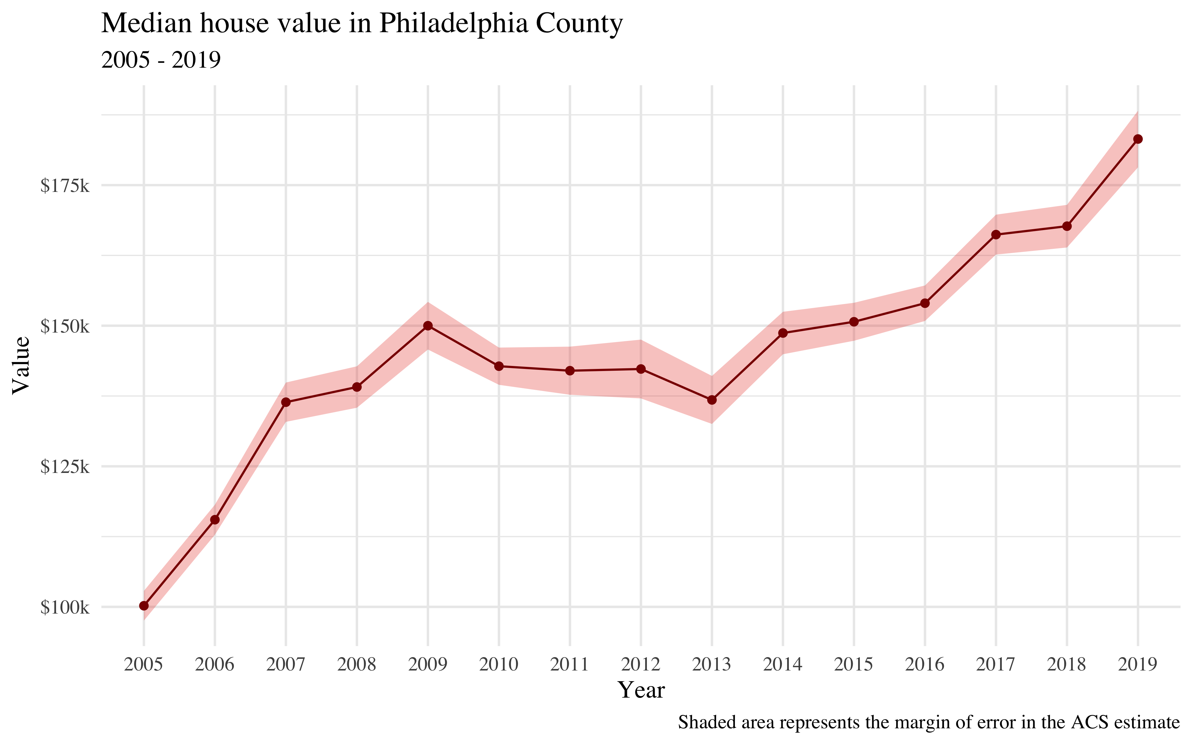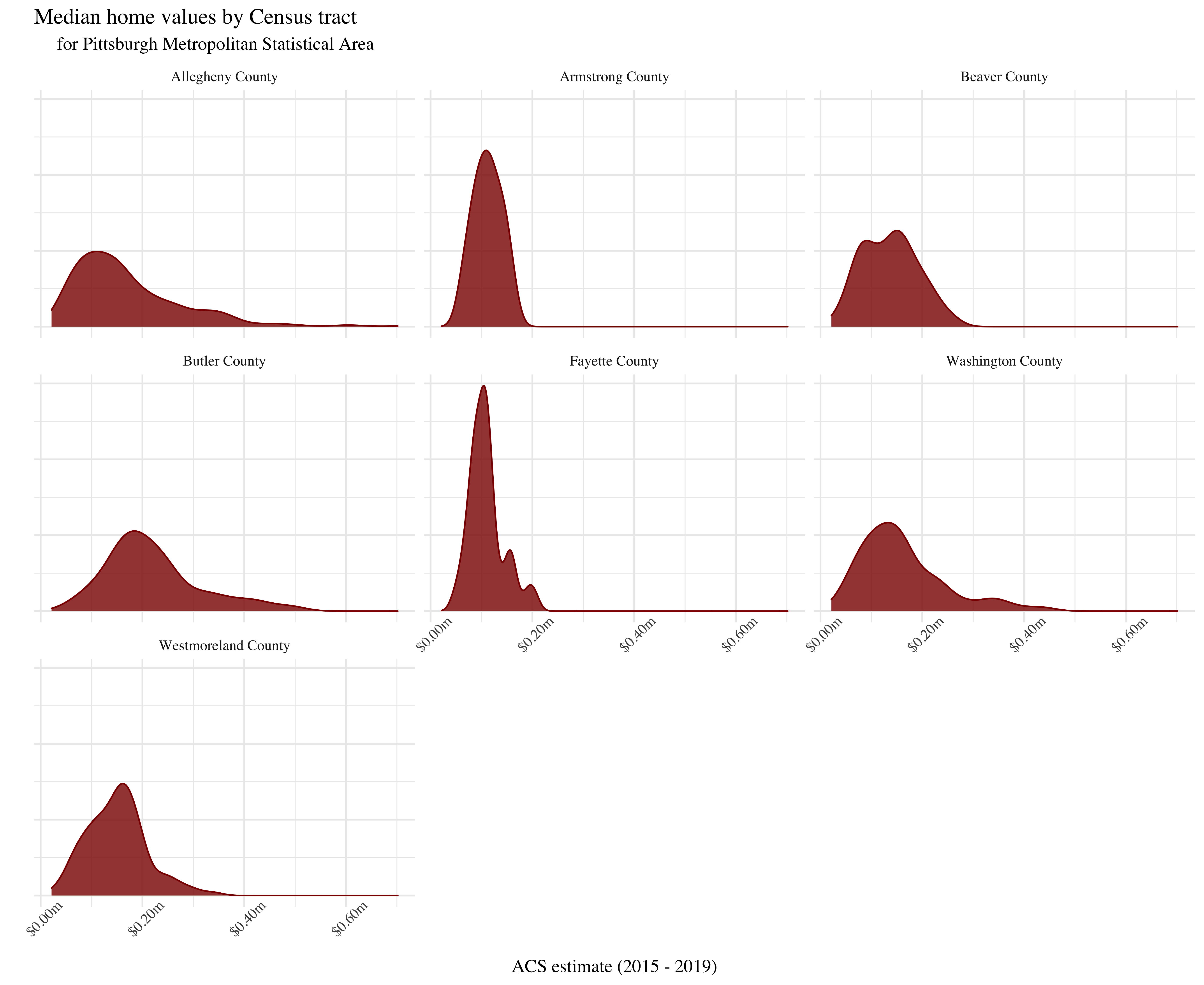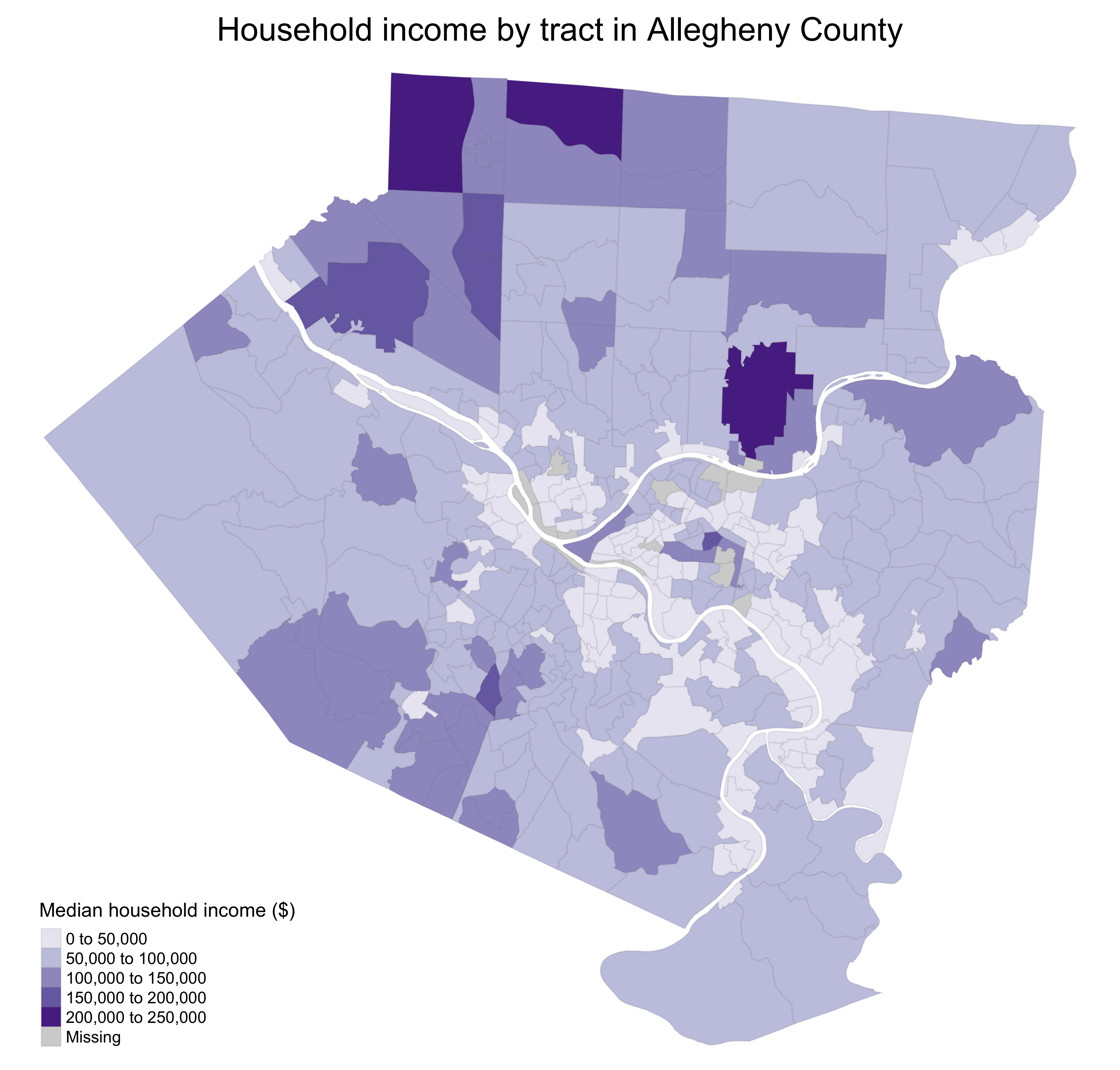 Moving to a closer look at Pennsylvania's two largest city, I've include several charts and maps detailing housing values, household income, and demographic characterstics across Philadelphia and Pittsburgh. A line chart, a beeswarm chart, and various measures of clustering are shown for Philadelphia below, while data on Pittsburgh is in the form of a density plot, a scatterplot, and various choropleth maps.