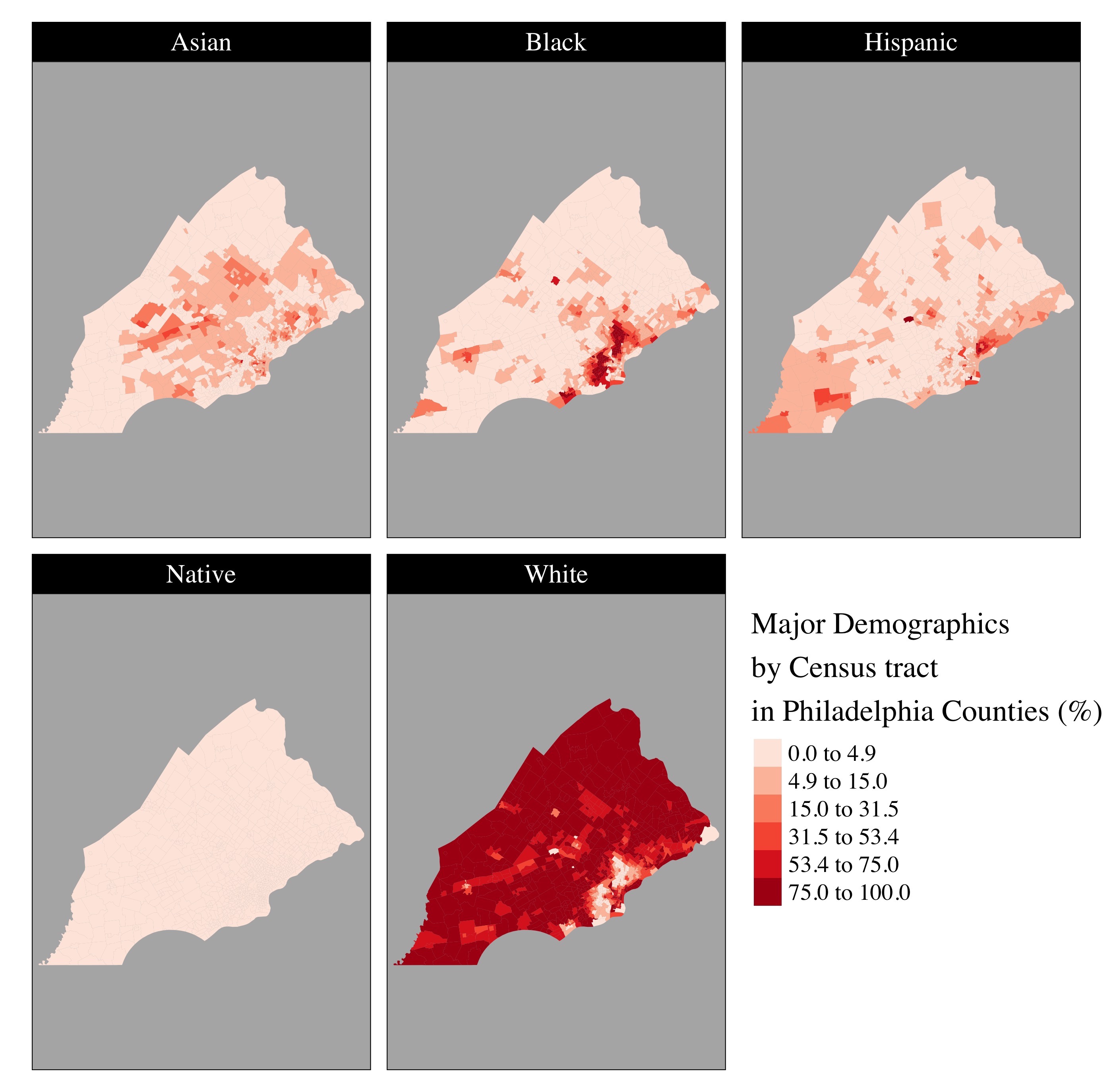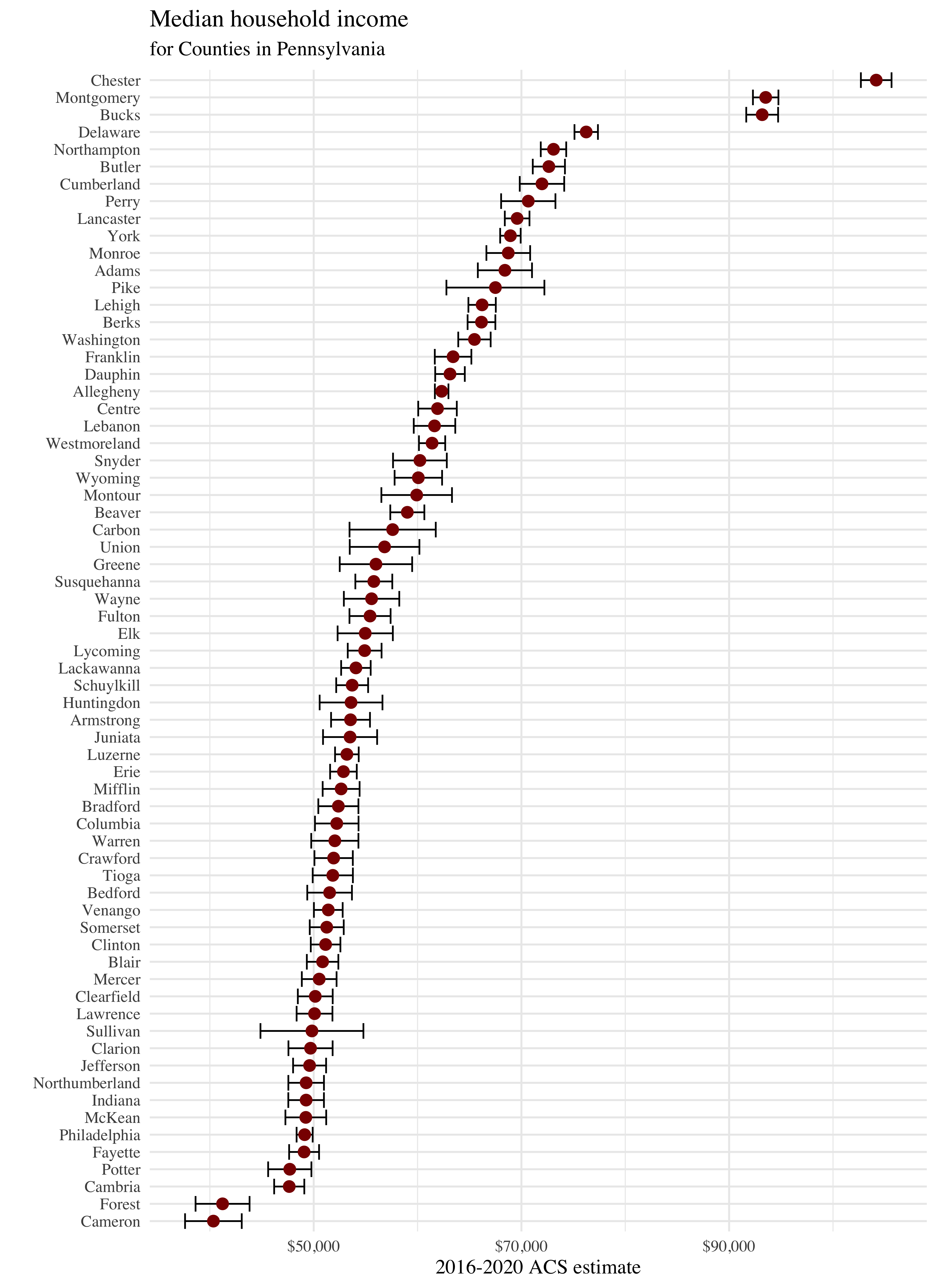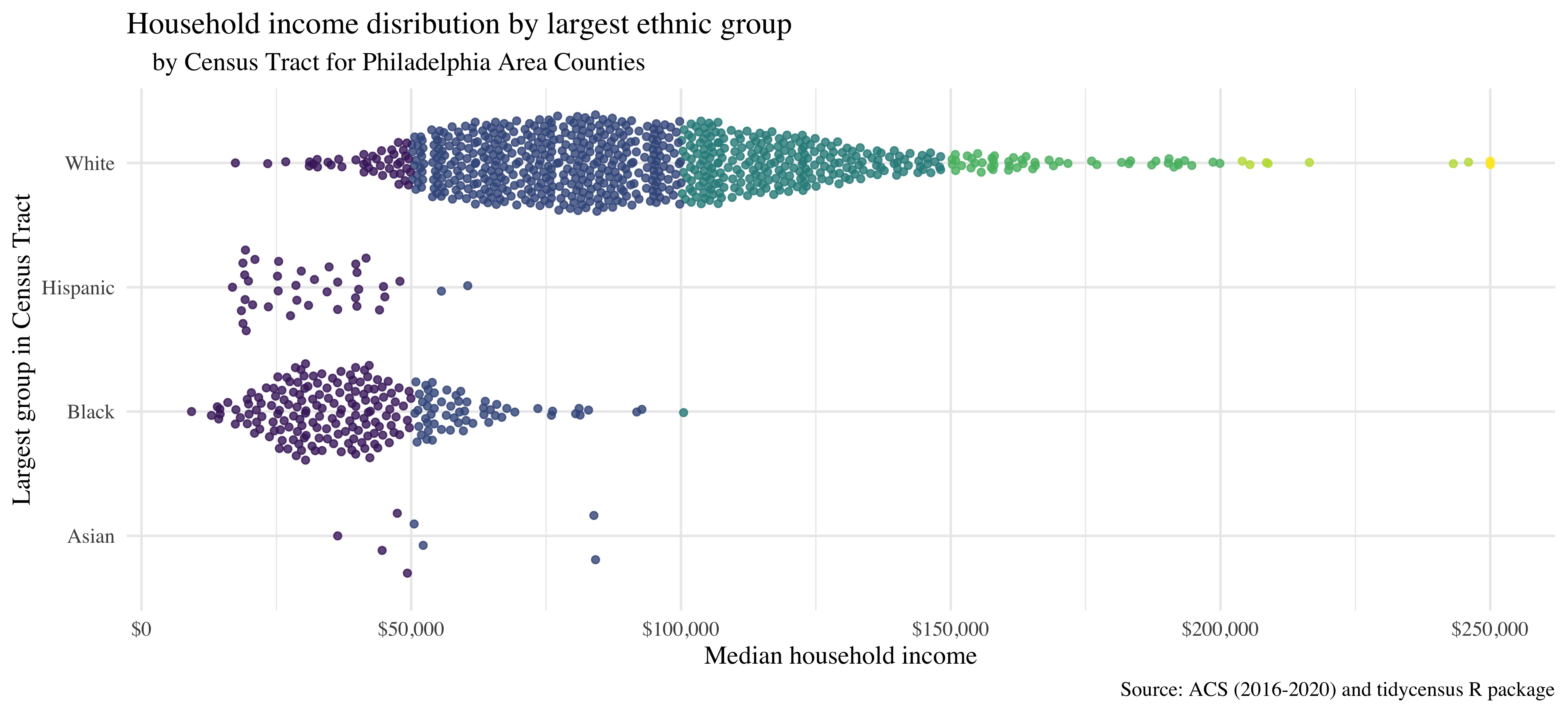 This chapter includes some of the early projections I developed when working through census data shorlty after starting at Penn State. Working through Walker's (2023) book Analyzing US Census Data: Methods, Maps, and Models in R, I familiarized myself with both with R and census data in Pennsylvania using recent ACS and census data. All analysis was performed in RStudio, with notable packages including ggplot, tmap, and ggbeeswam. Several of the outputs are shown below, with a couple from Pennsylvania as a whole including both the population pyramid and the point chart below, but also some of Philadelphia and Pittsburgh.